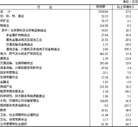 在城鎮(zhèn)固定資產(chǎn)投資中,國有及國有控股單位投資1306.87億元,比上年增長25.4%。第一產(chǎn)業(yè)投資32.13億元,增長25.2%;第二產(chǎn)業(yè)投資749.32億元,增長23.7%;第三產(chǎn)業(yè)投資1142.61億元,增長29.3%。 重點(diǎn)行業(yè)和重大項(xiàng)目投資帶動(dòng)作用明顯。全省電力工業(yè)投資446.09億元,增長38.3%;公路建設(shè)投資345.67億元,增長17.7%,水利環(huán)境和公共設(shè)施管理164.03億元,增長41.0%。