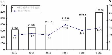 2001-2006年社會(huì)消費(fèi)品零售總額及其增長速度