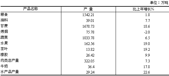 ,比上年增長1.8%,實(shí)現(xiàn)了從2003年以來連續(xù)4年增產(chǎn)的可喜成就。油料產(chǎn)量39.01萬噸,增長7.7%;烤煙產(chǎn)量75.78萬噸,下降2.0%;蔬菜產(chǎn)量1033.78萬噸,增長6.5%;水果產(chǎn)量162.56萬噸,增長19.0%;茶葉產(chǎn)量13.82萬噸,增長19.2%;鮮切花產(chǎn)量39.9億枝,增長8.1%。