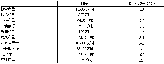 2006年,全省農(nóng)業(yè)再獲豐收,糧食播種面積穩(wěn)定,產(chǎn)量增加,果業(yè)持續(xù)快速發(fā)展,水果總產(chǎn)再創(chuàng)新高,畜牧業(yè)穩(wěn)定發(fā)展,產(chǎn)業(yè)化步伐加快。全省糧食播種面積5179萬畝,與上年基本持平。