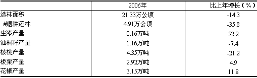 林業(yè)生產(chǎn)實現(xiàn)生態(tài)建設(shè)和經(jīng)濟效益協(xié)調(diào)發(fā)展。2006年,全省林業(yè)生產(chǎn)從過去的以退耕還林、增加造林面積、封山綠化為主,向提高林木質(zhì)量、保護森林資源、改善生態(tài)環(huán)境、增加林業(yè)產(chǎn)品產(chǎn)出方向轉(zhuǎn)變。主要林產(chǎn)品產(chǎn)量穩(wěn)定增長。