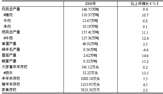 畜牧業(yè)生產(chǎn)穩(wěn)定發(fā)展,產(chǎn)業(yè)化步伐加快。2006年,我省繼續(xù)堅持把畜牧業(yè)作為農(nóng)業(yè)結(jié)構(gòu)調(diào)整的主導(dǎo)產(chǎn)業(yè),以市場為導(dǎo)向,以產(chǎn)業(yè)化發(fā)展為目標(biāo),以奶業(yè)發(fā)展為突破口,狠抓疫病防治、健全良種建設(shè)、推廣標(biāo)準(zhǔn)化飼養(yǎng)、大力實施科技興牧戰(zhàn)略,促進了畜牧業(yè)生產(chǎn)方式的轉(zhuǎn)變和畜產(chǎn)品生產(chǎn)能力的提高。