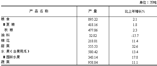 全年農(nóng)林牧漁業(yè)總產(chǎn)值883.54億元,比上年增長7.5%。其中,農(nóng)業(yè)產(chǎn)值638.60億元,增長7.7%;林業(yè)產(chǎn)值17.20億元,增長6.5%;畜牧業(yè)產(chǎn)值189.07億元,增長7.8%;漁業(yè)產(chǎn)值4.69億元,增長5.3%;農(nóng)林牧漁服務(wù)業(yè)產(chǎn)值33.98億元,增長4.9%。 全年農(nóng)作物種植面積382.83萬公頃(5742.50萬畝)。其中,糧食種植面積146.58萬公頃(2198.63萬畝),下降0.4%;棉花種植面積128.66萬公頃(1929.83萬畝),增長11.1%;油料種植面積15.17萬公頃(227.60萬畝),下降18.2%;糖料種植面積9.44萬公頃(141.60萬畝),增長35.1%;蔬菜種植面積18.68萬公頃(280.23萬畝),增長5.8%;瓜果類種植面積7.40萬公頃(111.03萬畝),增長4.9%。 全年糧食產(chǎn)量895.22萬噸,比上年增長2.1%;棉花產(chǎn)量218.01萬噸,增長11.4%;油料產(chǎn)量32.82萬噸,下降15.7%;甜菜產(chǎn)量555.53萬噸,增長32.6%。