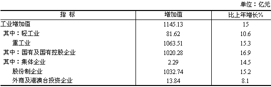 全年工業(yè)增加值1218.73億元,比上年增長15.2 %。其中,規(guī)模以上工業(yè)增加值1145.13億元,增長15.0%。