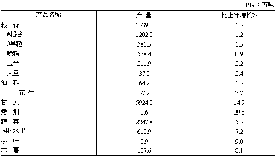 全年糧食種植面積3326.3千公頃,比上年減少24.6千公頃;油料種植面積311.9千公頃,減少2.2千公頃;甘蔗種植面積838.4千公頃,增加90.8千公頃;蔬菜種植面積1131.8千公頃,增加37.4千公頃;桑園面積111.2千公頃,增加27.5千公頃;烤煙種植面積15.9千公頃,增加2.0千公頃。 全年糧食產量1539.0萬噸,比上年增加22.7萬噸,增產1.5%;油料產量64.2萬噸,增產1.5%;甘蔗產量5924.8萬噸,增產14.9%;蔬菜產量(含菌類)2247.8萬噸,增產5.5