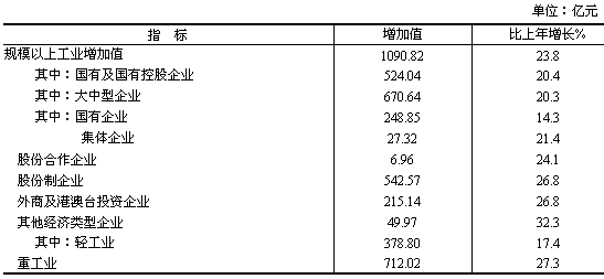全年全部工業(yè)增加值1595.83億元,比上年增長20.1%。規(guī)模以上工業(yè)增加值1090.82億元,增長23.8%;產品銷售率96.2%;工業(yè)新產品產值377.21億元,增長31.4%;工業(yè)品出口交貨值195.06億元,增長34.8%。