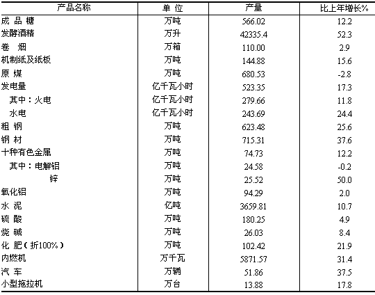 從主要行業(yè)看,黑色金屬冶煉及壓延加工業(yè)增加值105.14億元,增長36.8%;電力、熱力生產和供應業(yè)增加值133.57億元,增長21.1%;交通運輸設備制造業(yè)增加值90.00億元,增長24.0%;有色金屬冶煉及壓延加工業(yè)增加值92.14億元,增長25.1%;非金屬礦物制品業(yè)增加值58.05億元,增長41.5%;化學原料及化學制品制造業(yè)增加值71.72億元,增長34.6%;農副食品加工業(yè)增加值157.43億元,增長15.5%。 發(fā)電量523.35億千瓦小時,比上年增長17.3%;鋼材產量715.31萬噸,增長37.6%;內燃機5871.57萬千瓦,增長31.4%;汽車產量51.86萬輛,增長37.5%;水泥產量3659.81萬噸,增長10.7%;成品糖產量566.02萬噸,增長12.2%。