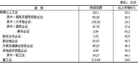 全年規(guī)模以上工業(yè)經濟效益綜合指數180.2,提高23.1點;主營業(yè)務收入3119.6億元,增長27.8%;利稅總額379.8億元,增長29.1%;盈虧相抵后實現利潤總額188.1億元,增長38.3%。