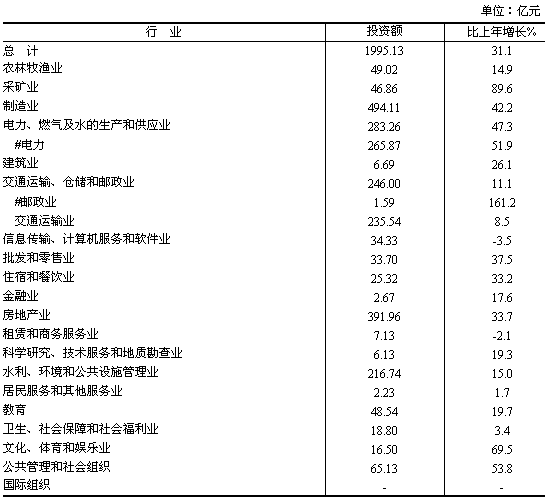 在城鎮(zhèn)固定資產投資中,從投資主體看,國有單位投資804.98億元,比上年增長13.7%;非國有單位投資1190.15億元,增長46.1%,其中民間投資1026.25億元,增長50.4%。從產業(yè)看,第一產業(yè)投資49.02億元,增長14.9%;第二產業(yè)投資830.92億元,增長45.8%,其中工業(yè)投資824.23億元,增長46.0%;第三產業(yè)投資1115.18億元,增長22.6%。