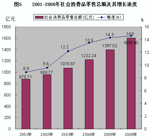 全年社會消費品零售總額1600.8億元,比上年增長14.6%。分城鄉(xiāng)看,城市消費品零售額943.8億元,增長15.2%;縣及縣以下消費品零售額657.0億元,增長13.8%。分經濟類型看,國有經濟實現零售額101.94億元,增長10.2%;集體經濟實現零售額54.74億元,增長12.8%;私營經濟實現零售額158.68億元,增長20.2%;個體經濟實現零售額1019.54億元,增長13.1%;聯營經濟實現零售額2.19億元,增長40.5%;股份制經濟實現零售額191.43億元,增長19.3%;外商投資經濟實現零售額14.13億元,增長31.6%;港澳臺投資經濟實現零售額2.91億元,增長1.44倍;其他經濟實現零售額55.28億元,增長14.8%。分行業(yè)看,批發(fā)和零售業(yè)實現零售額1380.1億元,增長14.6%;住宿和餐飲業(yè)實現零售額192.3億元,增長16.1%。 從商品主要類別看,在限額以上批發(fā)零售貿易業(yè)中,石油及制品類零售額106.35億元,比上年增長43.5%;通訊器材類零售額7.41億元,下降21.0%;家用電器和音像器材類零售額26.23億元,下降6.8%;汽車類零售額84.22億元,增長17.2%;體育娛樂用品類增長10.4%;文化辦公用品類下降14.4%;家具類增長2.47倍;建筑及裝潢材料類增長4.14倍。