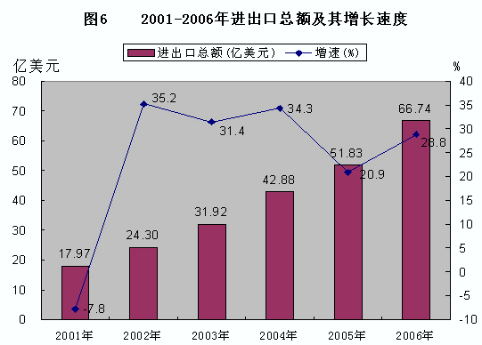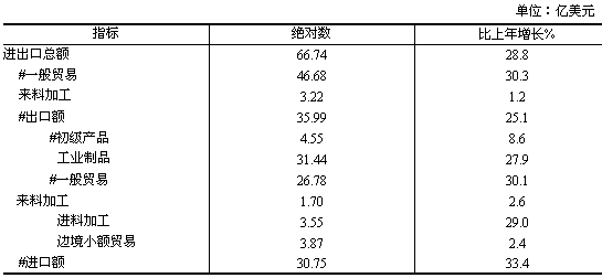 全年外貿進出口總額 66.74億美元,增長28.8%。其中,出口35.99億美元,增長25.1%;進口30.75億美元,增長33.4
