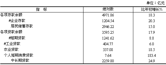 金融業(yè)增加值99.93億元,增長14.4%。 年末全部金融機構存款余額4971.86億元,比年初增長18.3%;全部金融機構貸款余額3595.25億元,比年初增長17.9%。