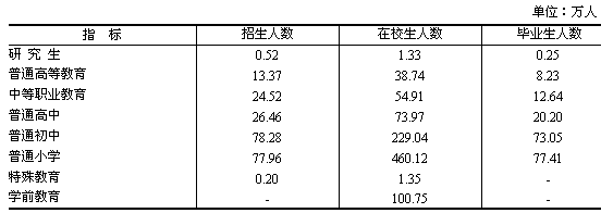 38.74萬人,畢業(yè)生8.23萬人。普通高中招生26.46萬人,在校生73.97 萬人,畢業(yè)生20.20萬人。普通小學招生