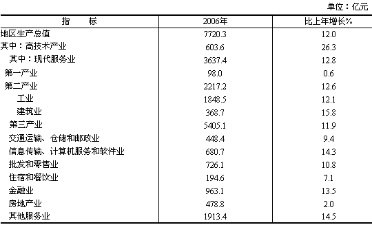 初步核算,全市實(shí)現(xiàn)地區(qū)生產(chǎn)總值7720.3億元,比上年增長12%,連續(xù)第8年實(shí)現(xiàn)兩位數(shù)增長。其中,第一產(chǎn)業(yè)增加值98億元,增長0.6%;第二產(chǎn)業(yè)增加值2217.2億元,增長12.6%;第三產(chǎn)業(yè)增加值5405.1億元,增長11.9%,占地區(qū)生產(chǎn)總值的比重達(dá)到70%。按常住人口計(jì)算,當(dāng)年人均GDP達(dá)到49505元(折合6210美元),比上年增長8.8%。三次產(chǎn)業(yè)結(jié)構(gòu)由上年的1.4:29.5:69.1變化為1.3:28.7:70。 全市現(xiàn)代服務(wù)業(yè)實(shí)現(xiàn)增加值3637.4