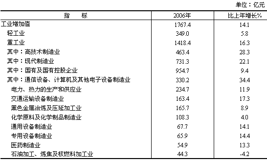 工業(yè):全市完成工業(yè)增加值1848.5億元,比上年增長12.1%。其中規(guī)模以上工業(yè)企業(yè)完成增加值1767.4億元,增長14.1%。在規(guī)模以上工業(yè)企業(yè)中,高技術(shù)制造業(yè)、現(xiàn)代制造業(yè)分別完成增加值463.4億元和731.3億元,分別增長28.3%和22.1%,占規(guī)模以上工業(yè)增加值的比重分別為26.2%和41.4%(二者有交叉部分)。通信設(shè)備、計(jì)算機(jī)及其他電子設(shè)備制造業(yè)完成增加值330.2億元,增長34.4%;交通運(yùn)輸設(shè)備制造業(yè)完成增加值163.4億元,增長17.3%。產(chǎn)銷銜接良好,產(chǎn)品銷售率為98.7%,比上年提高0.4個百分點(diǎn)。