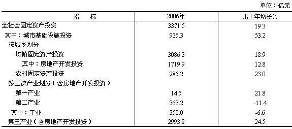 固定資產(chǎn)投資:全年完成全社會固定資產(chǎn)投資3371.5億元,比上年增長19.3%,增幅比上年提高7.5個百分點(diǎn)。在全社會固定資產(chǎn)投資中,完成城鎮(zhèn)投資3086.3億元,增長18.9%,增幅高于上年7.7個百分點(diǎn);其中房地產(chǎn)開發(fā)投資1719.9億元,增長12.8%,增幅提高9.3個百分點(diǎn),占全社會固定資產(chǎn)投資的比重為51%,比上年下降2.9個百分點(diǎn)。完成農(nóng)村投資285.2億元,增長23%,增幅高于上年4.3個百分點(diǎn);其中農(nóng)村基礎(chǔ)設(shè)施投資84.2億元,增長89.6%。