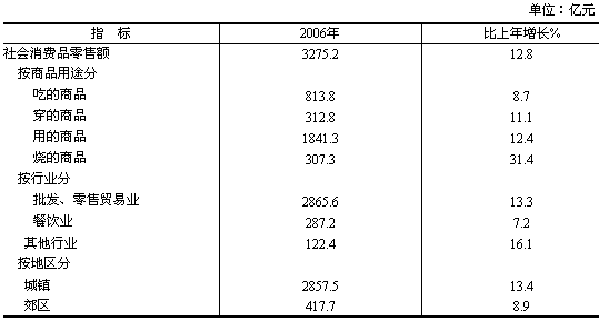 國內(nèi)貿(mào)易:全市實(shí)現(xiàn)社會消費(fèi)品零售額3275.2億元,比上年增長12.8%,扣除物價(jià)上漲因素,實(shí)際增長12.6%。在限額以上批發(fā)零售企業(yè)零售額中,通訊器材類增長21.2%,家用電器和音像器材類增長11.9%,家具類增長26.4%,汽車類增長17.3%,石油及制品類增長35.1%。