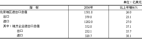 利用外資:全年新批外商投資項(xiàng)目2106個,比上年下降1.4%。實(shí)際利用外資45.5億美元,增長29.1%。在實(shí)際利用外資金額中,制造業(yè)10.6億美元,下降6.8%;租賃和商務(wù)服務(wù)業(yè)17.4億美元,增長40.3%;房地產(chǎn)業(yè)7.2億美元,增長55.9%;批發(fā)零售業(yè)2.4億美元,增長8.5倍。 開發(fā)區(qū):年末全市19個開發(fā)區(qū)累計(jì)入?yún)^(qū)企業(yè)35218個,其中投產(chǎn)開業(yè)企業(yè)27982個,分別比上年末增加4744個和1073個。全年各類開發(fā)區(qū)實(shí)現(xiàn)總收入8349.5億元,比上年增長31.5%;實(shí)現(xiàn)利潤452.8億元,增長17.7%;應(yīng)繳稅金364.4億元,增長29.9%。 中關(guān)村科技園區(qū)投產(chǎn)開業(yè)企業(yè)23869個。實(shí)現(xiàn)總收入6448億元,比上年增長31.7%;出口創(chuàng)匯124.8億美元,增長32.2%;實(shí)現(xiàn)利潤376.9億元,增長17.1%;應(yīng)繳稅金208.4億元,增長14.9%。 北京經(jīng)濟(jì)技術(shù)開發(fā)區(qū)投產(chǎn)開業(yè)企業(yè)1031個。實(shí)現(xiàn)總收入2000億元,比上年增長58.7%;實(shí)現(xiàn)利潤125億元,增長48.8%;應(yīng)繳稅金90億元,增長91.1%。