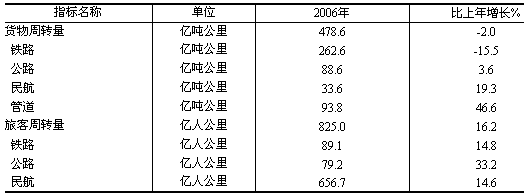 交通:全年貨物周轉(zhuǎn)量478.6億噸公里,比上年下降2%。其中,鐵路262.6億噸公里,下降15.5%;公路88.6億噸公里,增長3.6%;民航33.6億噸公里,增長19.3%;管道93.8億噸公里,增長46.6%。鐵路、公路、民航、管道各種運(yùn)輸方式貨物周轉(zhuǎn)量比重分別為54.9%、18.5%、7%和19.7%。與上年相比,公路、民航、管道比重分別上升1個、1.3個和6.5個百分點(diǎn),鐵路比重下降8.8個百分點(diǎn)。 全年旅客周轉(zhuǎn)量825億人公里,比上年增長16.2%。其中,鐵路89.1億人公里,增長14.8%;公路79.2億人公里,增長33.2%;民航656.7億人公里,增長14.6%。鐵路、公路、民航三種運(yùn)輸方式旅客周轉(zhuǎn)量比重分別為10.8%、9.6%和79.6%。與上年相比,公路比重上升1.2個百分點(diǎn),鐵路、民航比重分別下降0.1個和1.1個百分點(diǎn)。