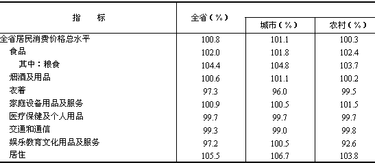 初步核算,全省實(shí)現(xiàn)生產(chǎn)總值7501.63億元,按可比價(jià)格計(jì)算,比上年增長13.4%。其中,第一產(chǎn)業(yè)增加值885.23億元,增長2.5%;第二產(chǎn)業(yè)增加值3736.08億元,增長17.0%;第三產(chǎn)業(yè)增加值2880.32億元,增長12.6%。人均地區(qū)生產(chǎn)總值21152元,比上年增長12.7%。 產(chǎn)業(yè)結(jié)構(gòu)繼續(xù)調(diào)整。第一產(chǎn)業(yè)有所調(diào)減,第二產(chǎn)業(yè)繼續(xù)保持增勢,第三產(chǎn)業(yè)發(fā)展穩(wěn)定。三次產(chǎn)業(yè)比例由上年的12.8:48.7:38.5調(diào)整為11.8:49.8:38.4。 居民消費(fèi)價(jià)格總水平比上年上漲0.8%(見表1),其中城市上漲1.1%,農(nóng)村上漲0.3%;消費(fèi)品價(jià)格上漲1.2%,服務(wù)價(jià)格下降0.5%。工業(yè)品出廠價(jià)格下降0.8%。原材料燃料動力購進(jìn)價(jià)格上漲3.9%。農(nóng)業(yè)生產(chǎn)資料價(jià)格上漲0.9%,比上年低7.2個(gè)百分點(diǎn)。