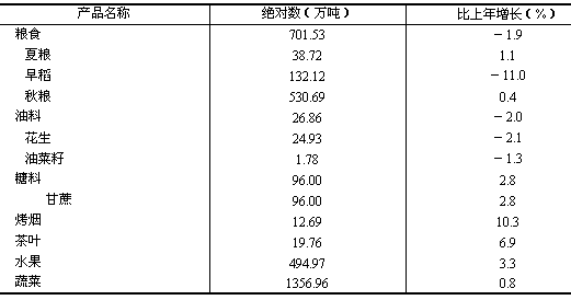 全省農(nóng)林牧漁業(yè)完成總產(chǎn)值1473.41億元,比上年增長3.0%,增幅比上年回落1.7個(gè)百分點(diǎn)。 糧食種植面積2093.76萬畝,比上年減少68.18萬畝;煙葉種植面積103.69萬畝,增加3.52萬畝;蔬菜種植面積956.67萬畝,增加8.59萬畝;花卉種植面積15.86萬畝,增加0.74萬畝;油料種植面積182.21萬畝,減少1.38萬畝。糧食產(chǎn)量701.53萬噸,比上年減產(chǎn)1.9%;煙葉產(chǎn)量12.84萬噸,增產(chǎn)10.1%;油料產(chǎn)量26.86萬噸,減產(chǎn)2.0%;蔬菜產(chǎn)量1356.96萬噸,增產(chǎn)0.8%,水果產(chǎn)量494.97萬噸,增產(chǎn)3.3%(見表2)。