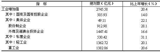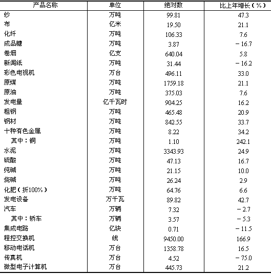 發(fā)電量904.25億千瓦小時(shí),增長16.2%;原煤1759.18萬噸,增長21.1%。 黑色金屬冶煉及壓延加工業(yè)總產(chǎn)值比上年增長32.9%,非金屬礦物制品工業(yè)增長28.6%,化學(xué)原料及化學(xué)制品制造業(yè)增長13.5%,有色金屬冶煉及壓延加工業(yè)增長31.1%。主要原材料產(chǎn)品中,鋼材842.55萬噸,增長33.7%;粗鋼產(chǎn)量465.48萬噸,增長20.9%;水泥3343.93萬噸,增長24.9%;十種有色金屬增長34.2%,硫酸、純堿、燒堿等主要化工產(chǎn)品增長2.9%至16.7%。 通用設(shè)備制造業(yè)總產(chǎn)值比上年增長27.6%,電氣機(jī)械及器材制造業(yè)增長16.0%,交通運(yùn)輸設(shè)備制造業(yè)增長24.8%。發(fā)電設(shè)備增長42.7%;汽車產(chǎn)量7.32萬輛,下降2.7%,其中轎車3.57萬輛,下降5.3%。 高技術(shù)產(chǎn)業(yè)總產(chǎn)值比上年增長26.4%。在高技術(shù)產(chǎn)業(yè)中,通信設(shè)備、計(jì)算機(jī)及其他電子設(shè)備制造業(yè)增長29.6%,其中彩色電視機(jī)、程控交換機(jī)、移動電話機(jī)、微型電子計(jì)算機(jī)等產(chǎn)品產(chǎn)量分別增長16.5%至166.9%(工業(yè)主要產(chǎn)品產(chǎn)量見表4)。