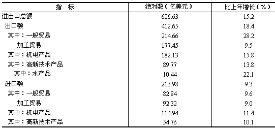 全省進(jìn)出口總額626.63億美元,比上年增長15.2%。其中,出口412.65億美元,增長18.4%;進(jìn)口213.98億美元,增長9.3%(見表7)。進(jìn)出口相抵,順差198.67億美元,比上年增加45.94億美元。