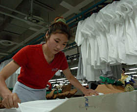 一位女工正在雅戈?duì)柤瘓F(tuán)的制衣車間內(nèi)工作。本報(bào)記者 王定昶