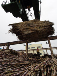 廣西南寧糖業(yè)股份有限公司伶俐糖廠一位工人在指揮卸甘蔗。新華社記者:張愛林