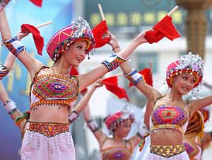 | 身著民族服裝的土家族演員們在表演傳統(tǒng)民間舞蹈。新華社記者 程敏