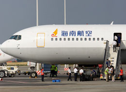 海南航空公司客機(jī)?吭诓剪斎麪枃H機(jī)場。新華社記者:徐金泉 攝