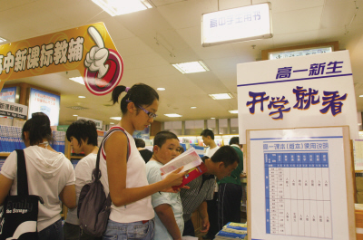| 北京高中生在書店里尋找新課標(biāo)教輔書籍 | “早就聽說高一新版教材改動很大,眼瞅著要開學(xué)了,想給孩子買點(diǎn)新版教材的參考資料,可搞不清楚怎么買,總不能整天讓孩子拿著《天龍八部》當(dāng)課本看吧?”家住北京潘家園的魏女士這兩天挺著急,因?yàn)榘幢本┦薪涛闹甘荆?007年秋季開學(xué),東城、西城、朝陽、昌平、順義、平谷、石景山、門頭溝和延慶等9個(gè)區(qū)縣所屬普通高中的高一年級學(xué)生將使用改版后的新教材。為了能讓自家的孩子盡快進(jìn)入學(xué)習(xí)狀態(tài),魏女士和很多高一學(xué)生家長到處尋找與新教材配套的教參教輔用書。然而眼看就要開學(xué)了,他們?nèi)匀灰黄H弧?/P>