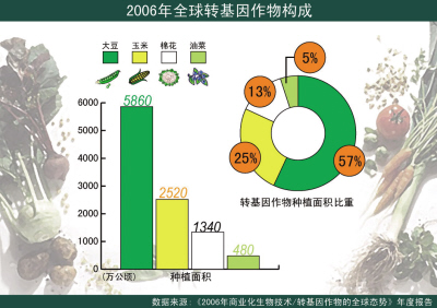 2006年全球轉基因作物的種植面積由1996年的170萬公頃發(fā)展到1.02億公頃,增長了60多倍,種植的國家達22個,還有29個國家批準轉基因作物作為食品或飼料進口,種植的農戶首次超過1000萬,90%的受益者是發(fā)展中國家的貧困農民。最可喜的是,因種植轉基因作物10年間累計減少使用殺蟲劑