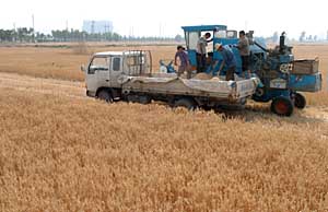 鄭州郊區(qū)農民收打小麥。攝影/本報記者