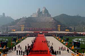 | 4月18日,106米高的炎黃二帝巨型塑像在鄭州黃河風景區(qū)落成。攝影/本報記者 趙鵬 |