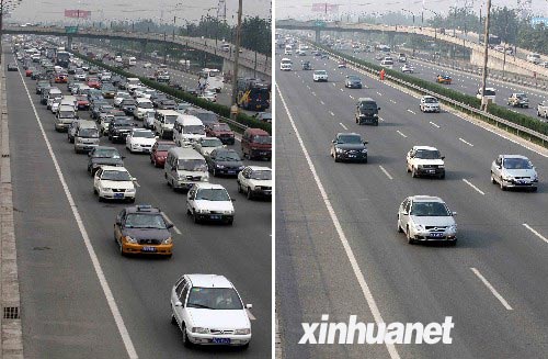 左圖和右圖分別為8月16日8時(shí)許和17日8時(shí)許在北京東四環(huán)小武基橋拍攝的車流。