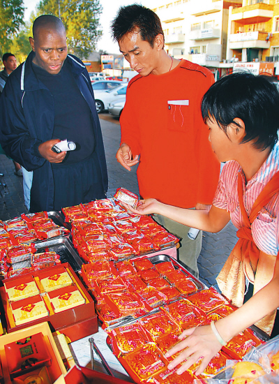 中秋節(jié)臨近,南非最大城市約翰內(nèi)斯堡的一些面向華人顧客的商店紛紛推出各式月餅。圖為9月15日,在該市西羅町唐人街,一名南非顧客(左)在選購(gòu)月餅。
