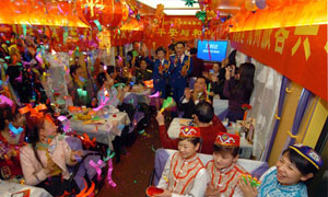 圖為在T69次列車上舉辦的“春節(jié)晚會”現(xiàn)場(2007年2月17日攝)。2月17日除夕夜,在北京開往烏魯木齊的T69次列車上舉辦了一場別開生面的列車“春晚”。列車乘務(wù)員自編自演節(jié)目,與旅客聯(lián)歡,共除舊歲! ⌒氯A社記者