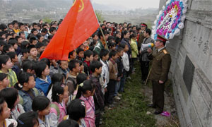 4月5日,在貴州省遵義縣南白鎮(zhèn)后壩紅軍烈士墓,遵義縣人武部政委朱松山(右)正在給后壩長征希望學(xué)校的學(xué)生講述紅軍長征的故事! ⌒氯A社記者