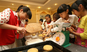 9月22日,農(nóng)村留守兒童和城里孩子一起學(xué)做月餅。中秋佳節(jié)將至,河南許昌20多名農(nóng)村留守兒童和城里孩子一起參加“相聚中秋,城鄉(xiāng)同樂”