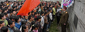 | 遵義縣人武部政委朱松山(右)正在給后壩長征希望學校的學生講述紅軍長征的故事。 |