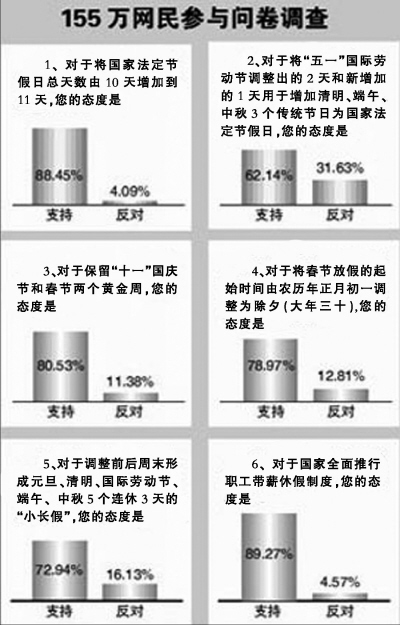 中立意見:馬小姐(超市員工) 其實(shí),放假調(diào)整對我們來說意義并不大,越是節(jié)假日越忙,各種促銷活動(dòng)特別多,客流也是平時(shí)的好幾倍。按規(guī)定,我們規(guī)定節(jié)假日是不能休息的,上班也都是倒著上的。在超市工作3年,我還沒在黃金周休息過,更別提出去玩了,幸虧假日上班有補(bǔ)貼。 據(jù)統(tǒng)計(jì),從9日上午至12日12時(shí),已有近185萬網(wǎng)民參加國家法定節(jié)假日調(diào)整草案民意調(diào)查,各界反響強(qiáng)烈。目前,調(diào)查時(shí)間已經(jīng)過半,結(jié)果顯示八成網(wǎng)民支持法定節(jié)假日調(diào)整方案。從最新投票結(jié)果看,法定節(jié)假日總天數(shù)由10天增加到11天的支持率為88%,調(diào)整“五一”并增加3個(gè)傳統(tǒng)節(jié)日為法定假日的支持率為67%,保留“十一”國慶節(jié)和春節(jié)兩個(gè)黃金周的支持率為81%,將春節(jié)放假時(shí)間提前到除夕的支持率為81%,將元旦、“五一”及3個(gè)新增法定假日與前后周末調(diào)整成連續(xù)3天“小長假”的支持率為76%,全面推行職工帶薪休假制度的支持率為90%。 “這次國家對法定節(jié)假日進(jìn)行調(diào)整,最大的亮點(diǎn)就是民眾成為政府決策的‘參謀者’。廣泛征求民眾意見,體現(xiàn)的就是黨和政府以人為本、重視民意的執(zhí)政理念!碧旖蚴猩缈圃航淌谕鮼砣A認(rèn)為,新休假方案只要符合大部分人意愿,更好地保障勞動(dòng)者的休息權(quán),讓公民休假權(quán)落到實(shí)處,相信人民會(huì)接受并給予支持。