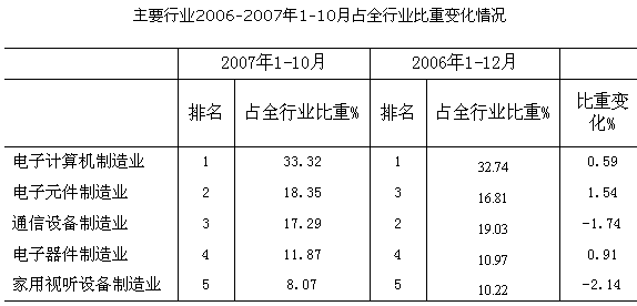 產(chǎn)業(yè)結(jié)構(gòu)調(diào)整繼續(xù)深化,各行業(yè)出現(xiàn)不同走勢。 (一)基礎(chǔ)行業(yè)逐步成為拉動產(chǎn)業(yè)增長的主要力量。今年以來,軟件業(yè)收入增速始終保持在20%以上,高出制造業(yè)平均增速4個百分點以上,特別是軟件技術(shù)服務(wù)和嵌入式軟件。1-10月軟件業(yè)占電子信息產(chǎn)業(yè)比重達11.2%,比年初提高0.5個百分點。1-10月電子元件、電子器件行業(yè)收入增速為27.4%和21.0%,比全行業(yè)平均增速分別高出7.7和1.3個百分點,占全行業(yè)比重分別達到18.4%和11.9%,比去年同期分別提高1.2和0.7個百分點。 。ǘ┯嬎銠C行業(yè)的帶動作用日益明顯。1-10月計算機行業(yè)實現(xiàn)收入增速22.7%,比產(chǎn)業(yè)平均水平高3個百分點,比去年同期提高4.9個百分點。其中,計算機整機制造業(yè)表現(xiàn)良好,實現(xiàn)收入6450億元,同比增長30%。 。ㄈ┩ㄐ旁O(shè)備制造業(yè)發(fā)展速度略有回調(diào)。今年自年初以來,通信設(shè)備行業(yè)發(fā)展速度始終低于全行業(yè)發(fā)展水平,1-10月實現(xiàn)收入6051.3億元,同比增長9.5%,比上月提高0.9個百分點,但仍比全行業(yè)平均水平低10.2個百分點。 。ㄋ模┘矣靡暵犘袠I(yè)繼續(xù)萎縮。1-10月家用試聽行業(yè)實現(xiàn)收入2826億元,占行業(yè)比重8.1%,比同期下降2個百分點,比年初下降1.2個百分點,收入增速僅保持個位數(shù)增長,到本月收入增速僅為5.2%,比全行業(yè)平均增速低近15個百分點。1-10月生產(chǎn)彩色電視機6622.2萬臺,比去年同期減少108.4萬臺,同比下降1.6%。