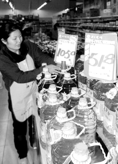12月8日,家樂福北京方圓店。 已經(jīng)大半年沒有買過食用油的陳先生一次性購買了兩桶5.4升裝魯花1級壓榨花生油。當時,該花生油售價為105.9元。而在數(shù)周前,這個價格還是99.9元!皟r格還會漲的。”家樂福油類貨架的促銷員說。 花生油僅僅是個縮影。據(jù)國家有關(guān)部門價格監(jiān)測顯示,在11月份的上半月內(nèi),國內(nèi)市場食用油價格呈現(xiàn)全面上漲之勢。其中,全國花生油平均零售價格為每升