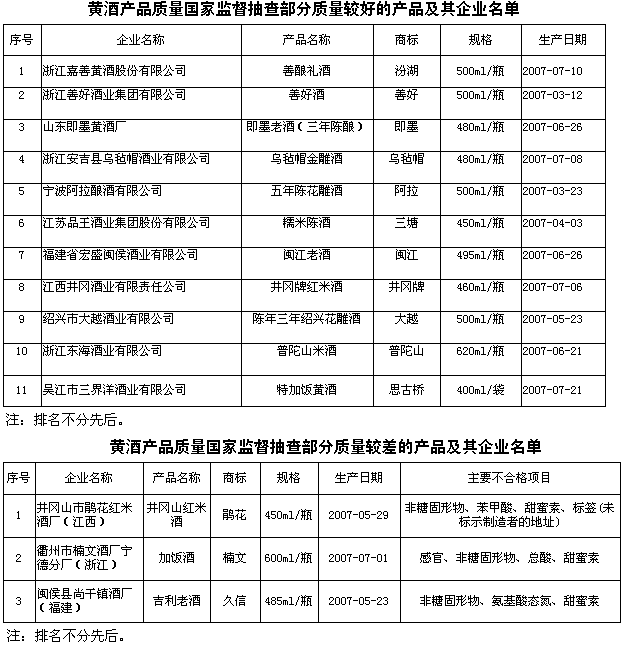 3、個別產(chǎn)品標簽標注不規(guī)范。強制性國家標準GB10344-1989《飲料酒標簽標準》規(guī)定,黃酒標簽必須標明產(chǎn)品名稱、產(chǎn)品類型、生產(chǎn)日期、保質(zhì)期、質(zhì)量等級、制造者的名稱、地址、酒精度、凈含量、配料表等。各類黃酒質(zhì)量等級分為優(yōu)級、一級和二級。抽查中有個別產(chǎn)品未標注質(zhì)量等級,產(chǎn)品名稱未反映產(chǎn)品真實屬性。