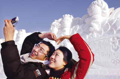 昨日(8日),2008中國(guó)沈陽(yáng)國(guó)際冰雪節(jié)大型雪雕《雅典―北京》、《龍騰奧運(yùn)》等亮相沈陽(yáng)棋盤(pán)山冰雪大世界。本屆冰雪節(jié)將于1月11日開(kāi)幕。圖為游客在大型雪雕《龍騰奧運(yùn)》前合影留念。 新華社 發(fā)