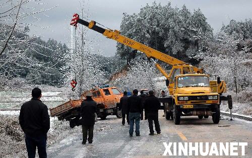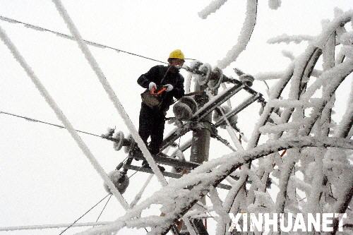 | 1月20日,黔東南州錦屏縣電力職工搶修遭受冰凍災(zāi)害的電力設(shè)施。