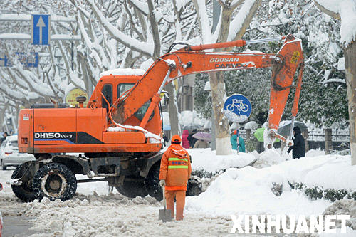 1月28日,一輛工程車在南京街頭清除積雪。