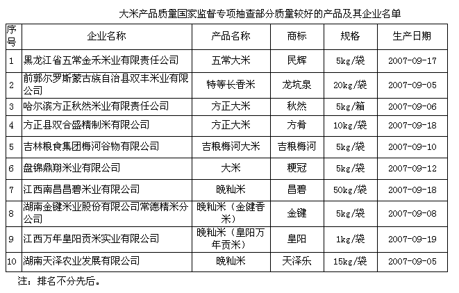 此次抽查依據(jù)GB1354-1986《大米》、GB2715-2005《糧食衛(wèi)生標(biāo)準(zhǔn)》、GB7718-2004《預(yù)包裝食品標(biāo)簽通則》等強(qiáng)制性國家標(biāo)準(zhǔn)規(guī)定的要求,對大米產(chǎn)品的黃粒米、水分、鉛、無機(jī)砷、汞、鎘、六六六、滴滴涕、馬拉硫磷、殺蟲雙、殺螟硫磷、稻瘟靈、丁草胺、黃曲霉毒素B1以及標(biāo)簽等15個(gè)項(xiàng)目進(jìn)行了檢驗(yàn)。經(jīng)檢驗(yàn),涉及人體健康的主要安全項(xiàng)目黃曲霉毒素B1、重金屬含量、農(nóng)藥殘留等指標(biāo)全部符合國家標(biāo)準(zhǔn)規(guī)定的要求。