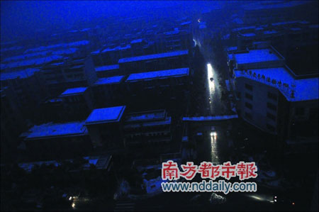 入夜以后,湖南郴州市區(qū)一片漆黑,這個城市已經連續(xù)停電停水6天。 張志韜 攝 |